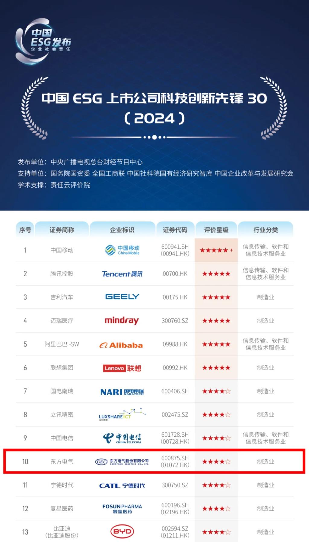 克日,,,,,,,由中央广播电视总台团结国务院国资委、天下工商联、中国社科院国有经济研究智库、中国企业刷新与生长研究会等权威机构团结推出的《科技立异ESG行动报告(2024)》正式宣布。。。。。东方电气依附在科技立异和ESG(情形、社会和公司治理)领域的卓越体现,,,,,,,乐成入选“中国ESG上市公司科技立异先锋30(2024)”榜单,,,,,,,位列榜单第十位。。。。。