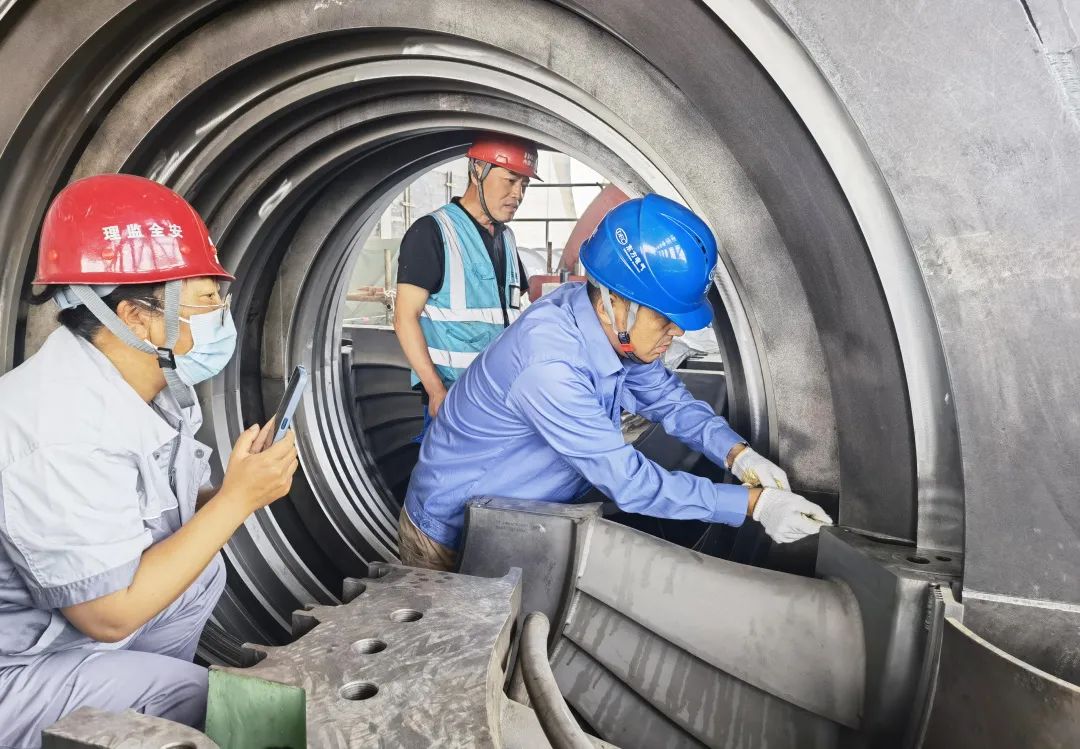◆东方汽轮机项目治理中心职工正在与相助单位检查包钢三期1号机
