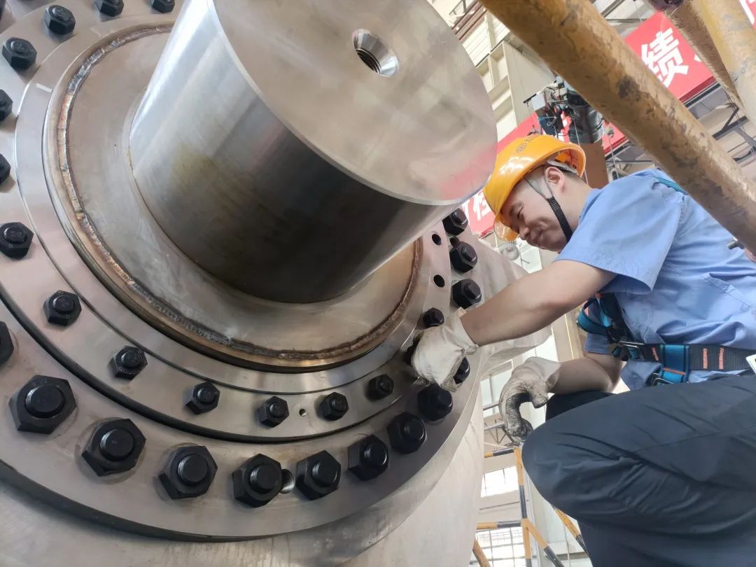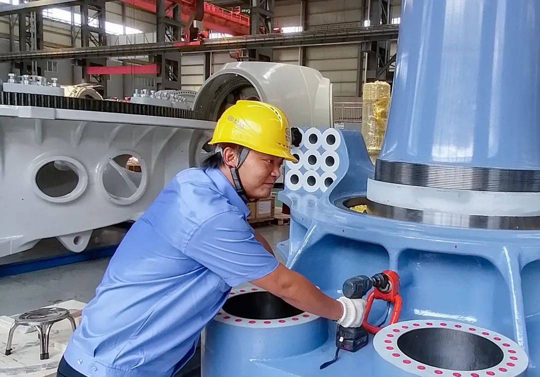 ◆东方电机水轮机分厂内,,,,,,蟠龙3号机球阀轴规则在举行装配作业