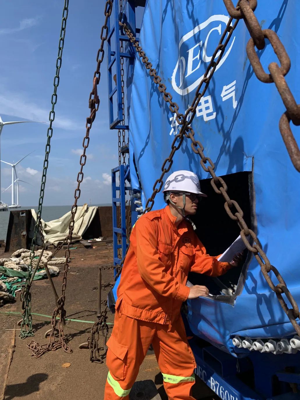 ◆东方国际职工正在核对越南长海3期海优势电项目相关数据,,,,,,协调风机吊装事情